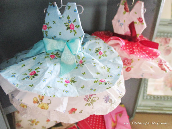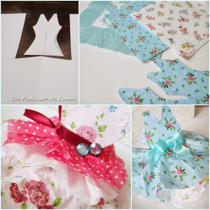 Con cartulina, diferentes servilletas y hasta kleenex, me entretuve una tarde mientras veía una peli confeccionando "a mi manera" estos vestiditos.