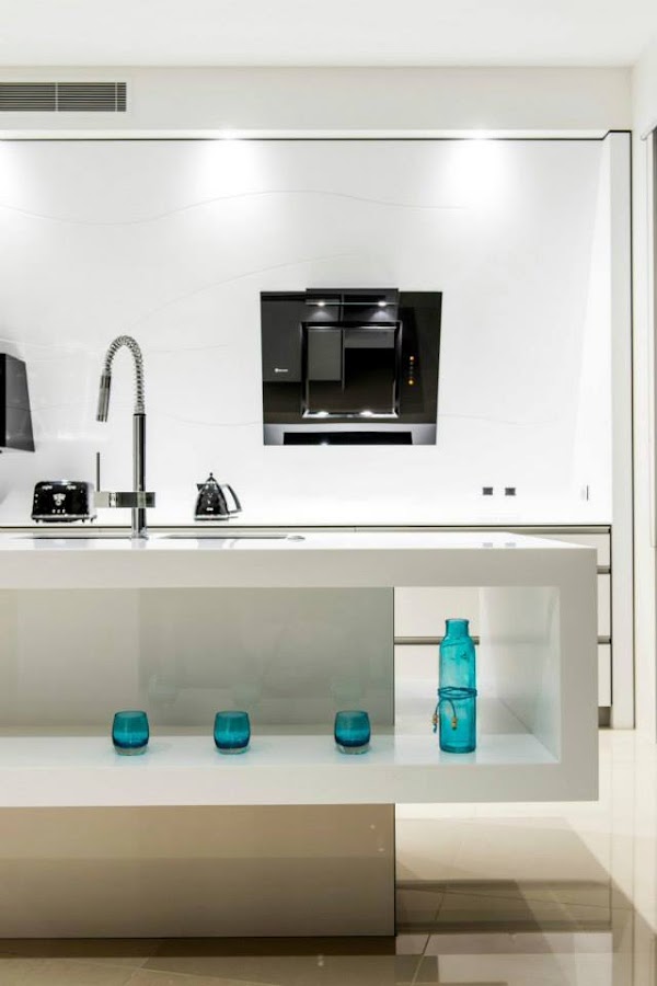 A continuación, la zona de cocción está situada en la larga superficie de trabajo, que se une con la singular pared inclinada hecha también con Staron, decorada con ranuras en forma de ondas y donde se han empotrado un par de hornos y la cafetera.