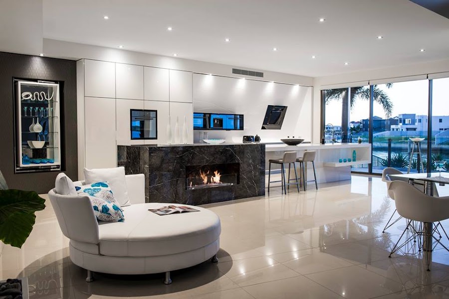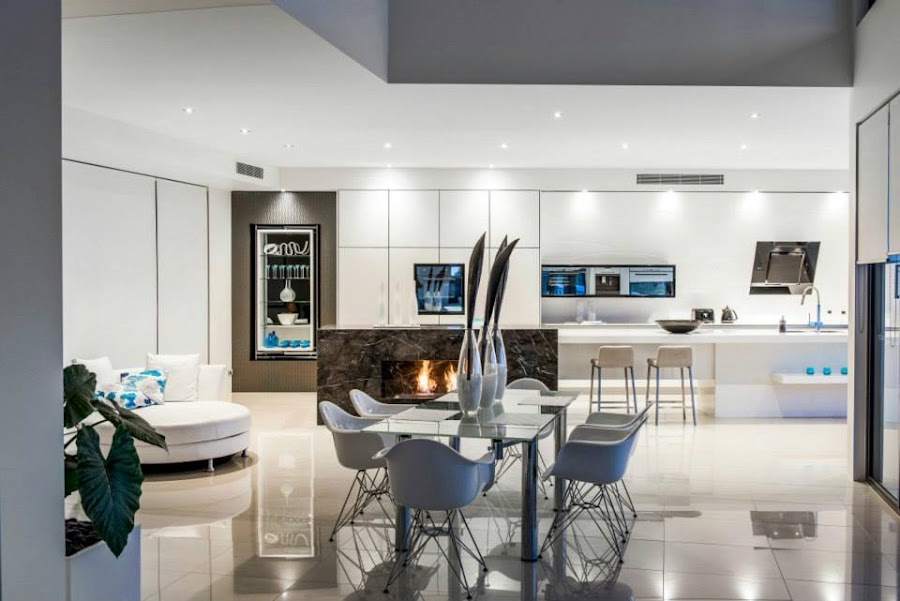 Una espectacular pared inclinada, una isla a diferentes alturas y una chimenea de bioetanol y mármol negro, caracterizan a ésta cocina donde las líneas, acabados y materiales representan la máxima expresión con los mínimos elementos.