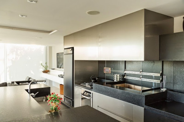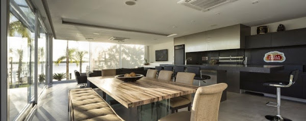 Con una línea de tiempo de construcción de sólo 30 días, esta moderna Casa piscina en Brasil impresiona con sus líneas esbeltas y acogedores espacios de relajación al aire libre. Al planificar la residencia, los arquitectos de Kali Arquitetura decidieron que un borde del prisma se colocara en la frontera de la tierra, y las otras tres paredes sería grandes paredes de vidrio móviles (puertas correderas que permiten una estrecha integración con el entorno). Para esto era necesaria una construcción que fuera desarrollada en un corto período de tiempo, se eligió una estructura metálica. Esto también hace que la casa sea ligera, un factor positivo teniendo en cuenta la proximidad del río.