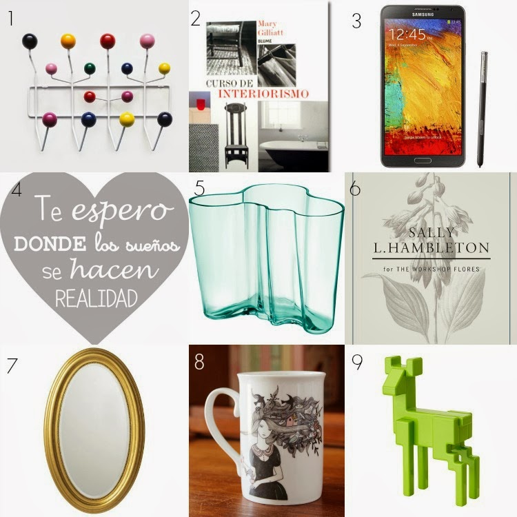 1. colgador hang it all de los Eames, a la venta en Vitra//2. Libro Curso de Interiorsimo de Mary Gilliat//3. un teléfono móvil con pantallaca, me da igual que sea de la marca de la manzanita, Samsung y Pericophone, pero grande por fissss//4. Vinilo de Boho Deco Chic//5. Jarrón de Alvar Aalto a la venta en VinÇon//6. Taller de arreglos florales con Sally Hambleton//7. espejo Lavenger de Ikea//8. taza de Lady Desidia//9. adorno renito Samspelt de Ikea