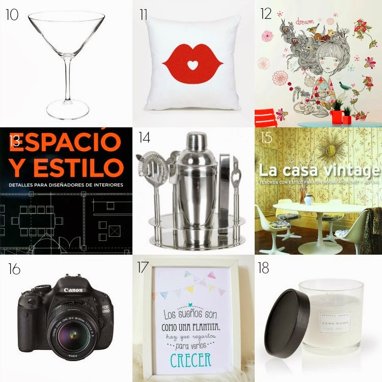 10. copas de cocktail//11. cojín amoroso de la shop de Mi Vida en Rojo//12. vinilo de Lady Desidia para Chispum//13. Libro Espacio y Estilo//14. kit para hacer cocktails (o se pensaban sus majestades que las copas se iban a quedar vacías?)//15. libro La casa Vintage//16. cámara reflex (no tiene por qué ser ésa)//17. lámina preciosa de Boho Deco Chic para recordar que todos los días hay que regar los sueños//18. vela grande Black Vanilla de Zara Home, adoro su olor y ya lo asocio con mi "hogar"