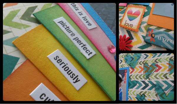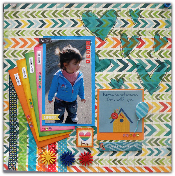 Pues yo he cogido uno de los papeles que tengo con más colorido, y a por ello! He utilizado uno de la marca BoBunny, de la colección KeyLime. Lleno de color, con una foto que combinara con los colores (de Abril, de marzo de 2013) y completando con detalles (cartulinas, perlitas, corazones... ) en los mismos tonos.