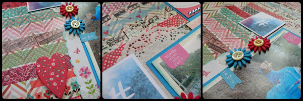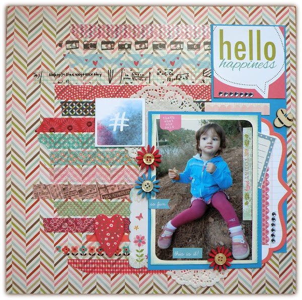 Pues aquí está mi propuesta. Como no, Abril como modelo, de una foto del año pasado. He creado un fondo con washi tapes, que le da color a la página, con la composición encima.