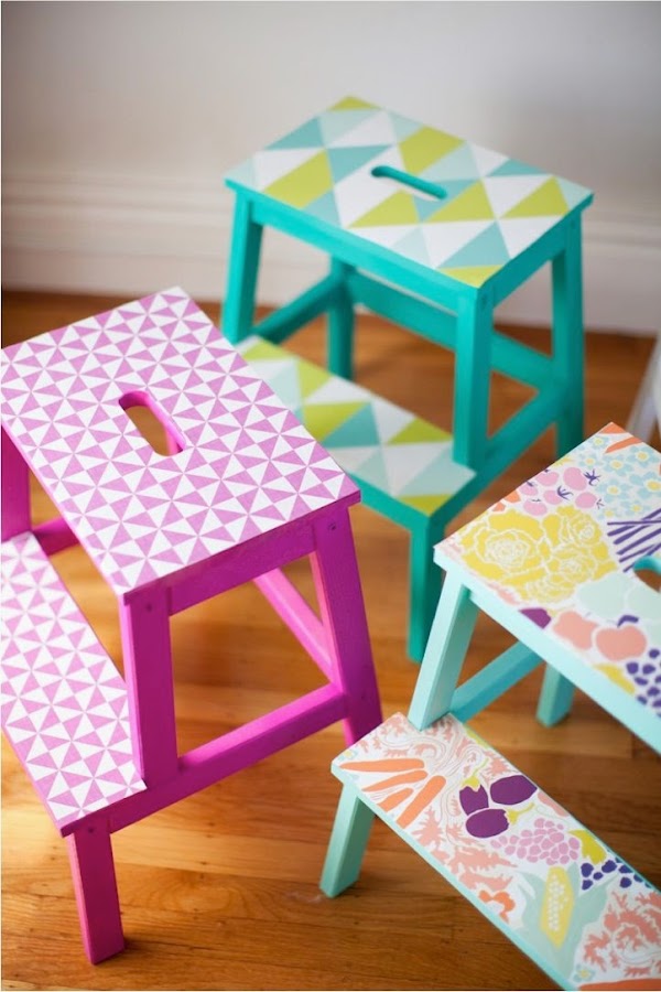 Color Color y más Color para sonreirle a la vida!!! Todos tenemos en casa un taburete Bekvan. O no? Para los niños va fenomenal! El mío ya pedía a gritos un cambio de look así que me puse a buscar y aquí te traigo el que más nos gustó. Lo seguro es, que así pintados y empapelados, estos taburetes deberían estar por toda la casa!!! Son tan bonitos!!! Alegres y frescos!!! En la terraza o en el bal ...