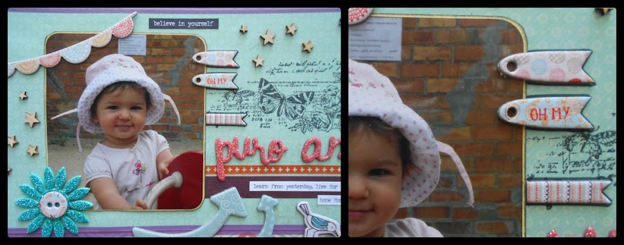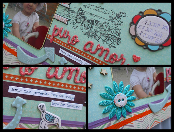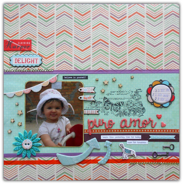 Y como estamos en el "mes del amor" y me encanta utilizar el troquel de sr. Piruleta con el que salen estas palabras tan xulis PURO AMOR, con este layout participo en el reto de Scrapbookpasion.