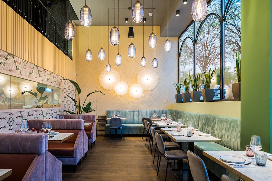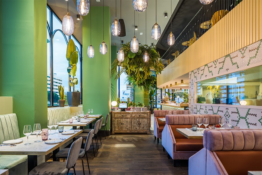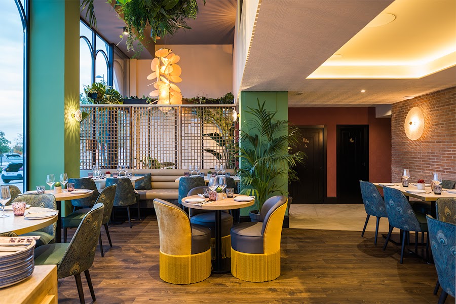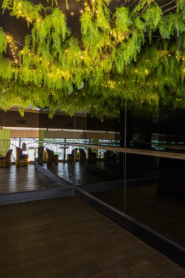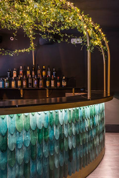 En esta zona predominan los tonos oscuros, y nada más entrar te encuentras con una imponente barra estampada con azulejos que parecen plumas de pavo real y cubierta por vegetación con pequeños led que le dan mucho encanto.