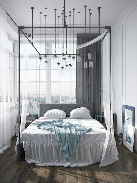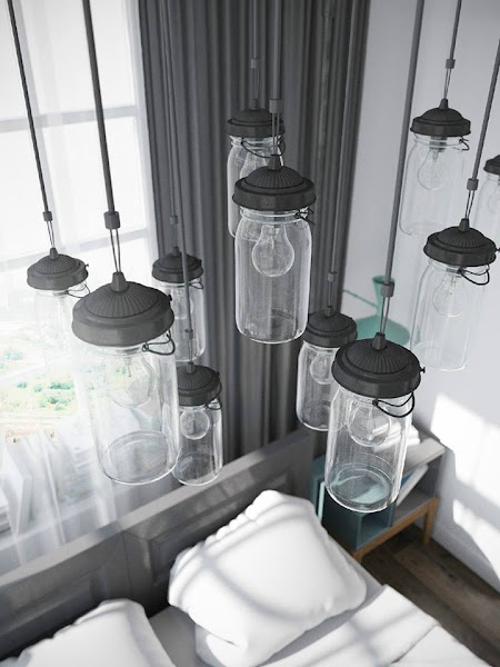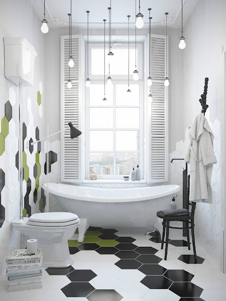 El dormitorio resulta un espacio original de la mano de una cama con dosel metálico en negro y una lámpara colgante de bombillas en distintas alturas. Un diseño muy efectista y lleno de creatividad que crea la estancia ideal para el descanso. El baño es otro de los rincones encantadores de este proyecto, en el que se juega con el color verde, blanco y negro con piezas cerámicas hexagonales. las protagonistas siguen siendo las bombillas colgantes.