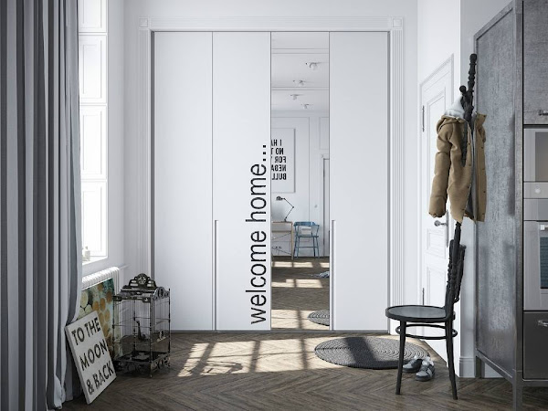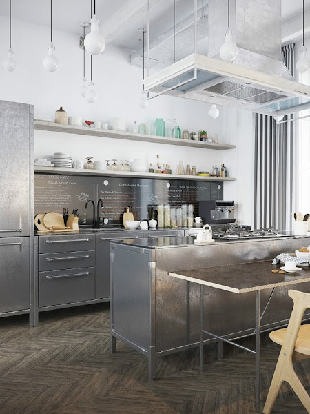 La decoración industrial vintage y el punto ecléctico e informal quedan patentes ya desde la puerta de entrada, donde descubrimos un armario con puertas blancas y letras de bienvenida, completamente integrado en el espacio, con un diseño original y que lo aleja de ser un simple elemento contenedor. La cocina es lo que más me gusta y no puede ser más industrial con el mobiliario en acabado metálico, pizarra y los elementos de menaje a la vista. Funcionalidad y diseño es un espacio práctico y versátil con mucho carácter. La zona de cocción se plantea en la isla central con una gran campana extractora. La mesa de comedor se adosa a la isla encimera y se integra perfectamente en el ambiente de cocina.