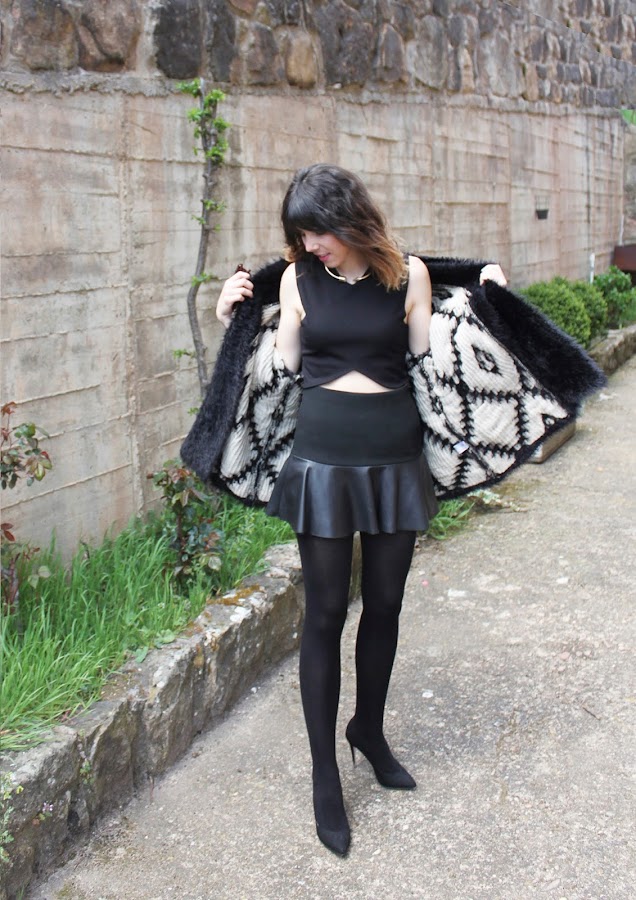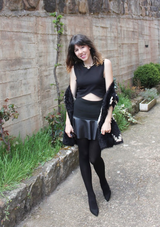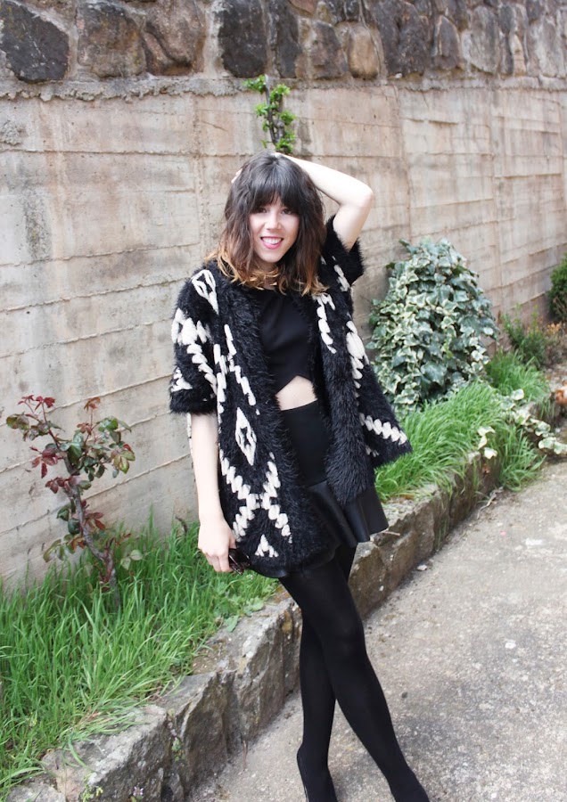 La falda, el crop top y el collar son de Zara, la chaqueta de punto oversize la conseguimos en Portobello Market en Londres y los zapatos son de Pull and Bear.