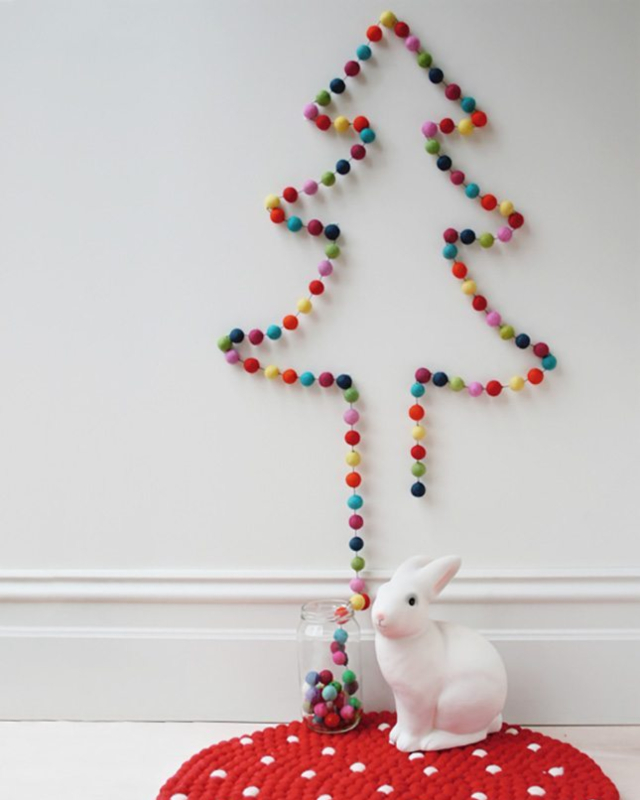 Primero tenemos que crear una guirnalda con pompones de fieltro. Cuando ya la tengamos realizada de una largura considerable, con la ayuda de unos pequeños cuelga-fáciles, la colocamos en nuestra pared simulando un gran abeto navideño ¡Además podemos hacerla de los colores que más nos guste!