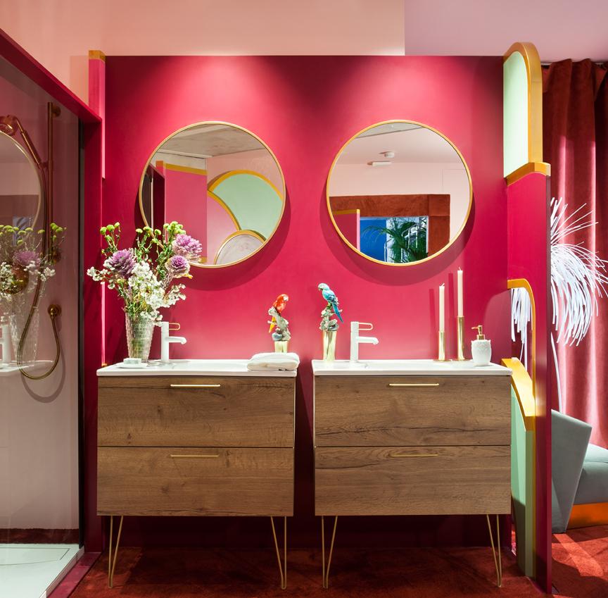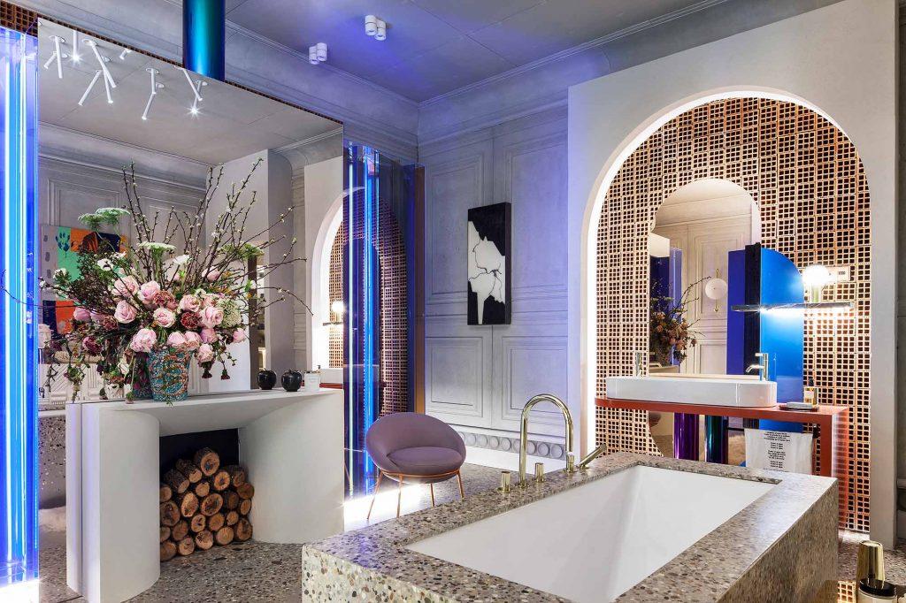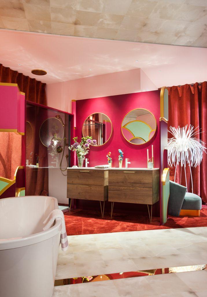 El espacio “Odeon” es un nuevo concepto de baño luxury donde las texturas cálidas combinan con elementos arquitectónicos de líneas depuradas para lograr una nueva imagen de la femineidad. Una de las piezas clave es el biombo central en tonos rosáceos y verdes inspirado en los años 20 y que es uno de los símbolos del estudio. En el espacio destaca también la bañera redonda Evok de Jacob Delafon con grifería Purist a suelo o el plato de ducha Neus con la mampara Contra don perfilería negra.