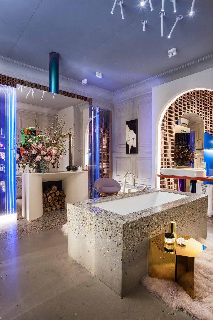 Respecto a los sanitarios, Geberit ha dispuesto una bañera exenta con unos bordes de terciopelo. Los inodoros elegidos para la ocasión han sido AquaClean Mera y AquaClean Sela con sus sistemas RimFree®.