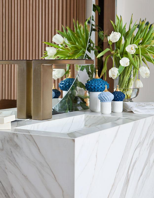 El resultado del conjunto es un espacio con tonos blancos, dorados y empolvados, un lugar sensual donde evadirse.