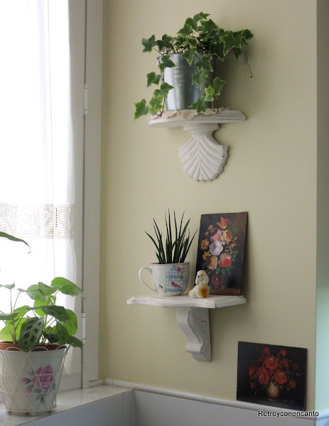 Una cosa muy curiosa que nos ocurre cada vez que participamos en un mercadillo, es el interés que despertamos entre los caballeros... Poneos en situación; fulanita le deja caer a menganito, el domingo por la mañana, que el mercadillo de su zona de residencia está operativo ese día... Menganito sabe que no hay escapatoria posible, y que le espera una paseo de lo más aburrido entre ropa y complementos que, al menos en nuestra ciudad, es lo que más abunda. Pero, de repente, en medio del sopor, un trozo de madera aparece ante sus ojos (¡nuestras maderas!). El susodicho recupera al instante la ilusión, se acerca a nuestro puesto, pregunta, curiosea, se informa... mientras la parienta respira aliviada al tener unos minutillos libres para probarse o curiosear, sin la carabina de la cara larga al lado ¡Y todos contentos! La primera venta de nuestra vida en un mercadillo fue un espejo de bronce de pared adquirido por un amable señor. La ménsula verde mint en esquina se convirtió en el capricho de otro caballero, encargado de convencer a su esposa de lo bien que quedaría en tal o cual sitio. Y de las tablitas de flores que abajo veis, la grande y una de las pequeñas también volaron en manos de sendos varones.