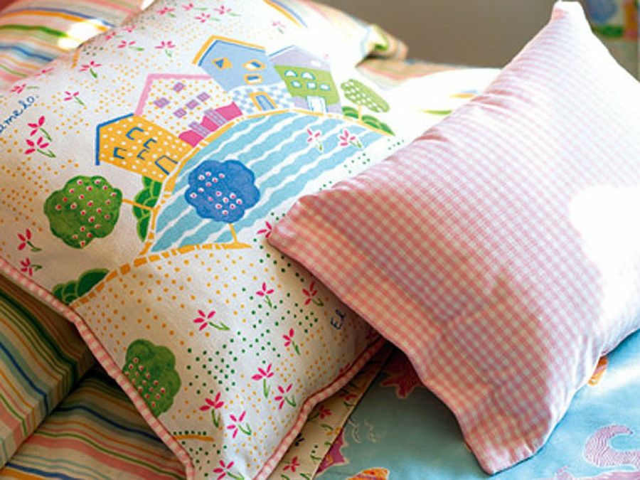 Una proposición más para los más pequeños son los estampados multicolores. En la fotografía observamos cómo estos cojines de Lienzo de los Gazules coinciden en colores con la ropa de cama. A cuadros o con motivos infantiles variados y combinados, alegrarán el dormitorio al completo.