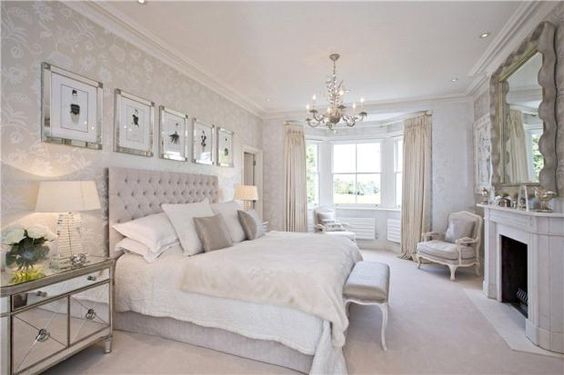 Decoración con muebles espejados, y predominio de los colores plata y oro en lineas modernas.Aquí puedes ver un dormitorio de este precioso estilo