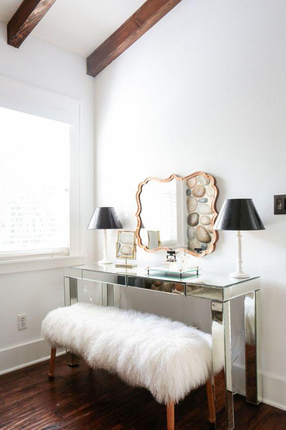 Si no tienes mucho espacio de sobra, y no quieres llenar tu dormitorio de mesas que no utilizas, puedes colocar un espejo pequeño en tu escritorio, que puedas quitar y poner en cualquier momento, así tendrás dos espacios en uno. Destina una parte de tus cajones a guardar todo lo que necesitas y…¡ya tendrás tu propio tocador!