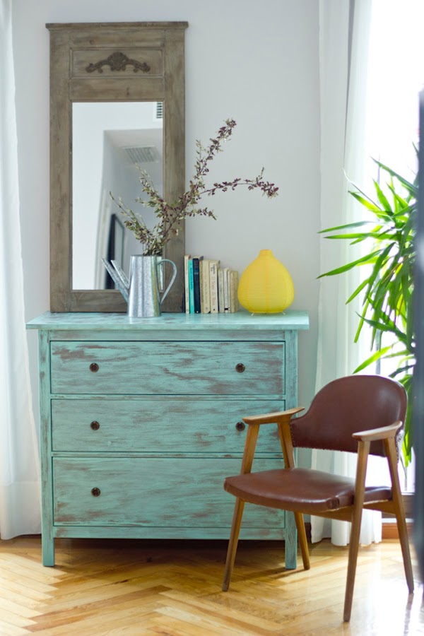Partiendo de una cómoda básica marrón consiguieron un mueble único de aspecto vintage precioso. ¿El truco? Pintar la superficie de un color verde agua y lijar algunas zonas para sacar el color de fondo. Cambio de tiradores por otros de aspecto antiguo y listo: ¡Una preciosa cómoda color mint que queda bien en cualquier lugar!