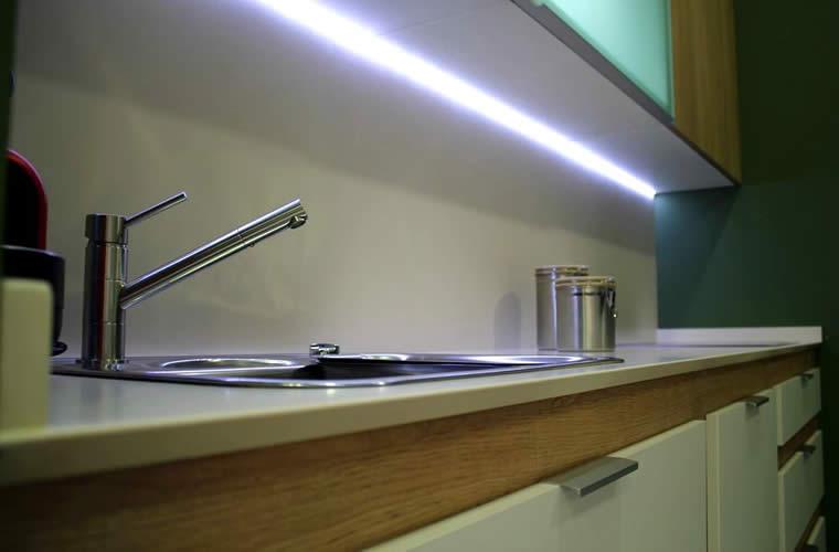 Como dijimos anteriormente, la iluminación LED puede utilizarse en todos los espacios, y la cocina es uno de ellos. Basta con que ubiquemos una tira de luces en alguna encimera o justo donde están las reservas de los vinos. Se pueden combinar con luces cálidas.
