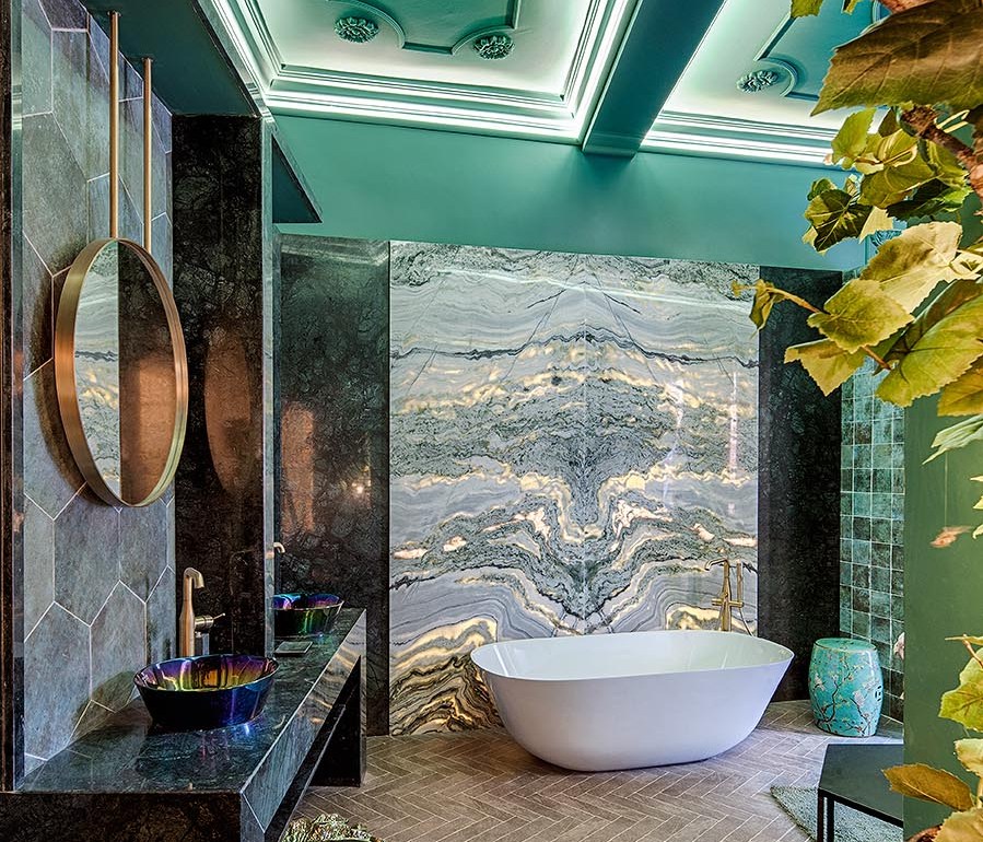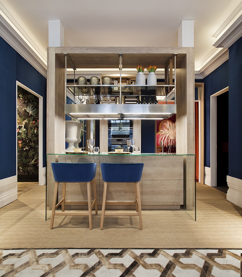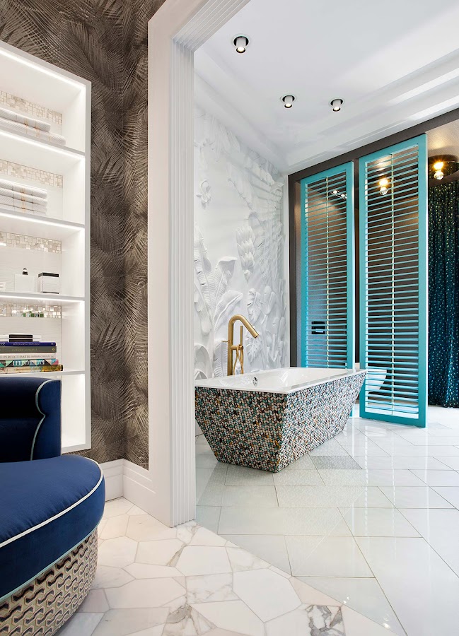 Sorprendente el mural tallado a mano diseñado por Miguel Muñoz y realizado por Italica Decoraciones con una escena tropicalista, no? Estaréis de acuerdo conmigo en que igualmente sorprendente es la bañera Geberit, personalizada con un textil geométrico de SICIS Madrid inspirado en las teselas de la firma italiana. ¡Guau!