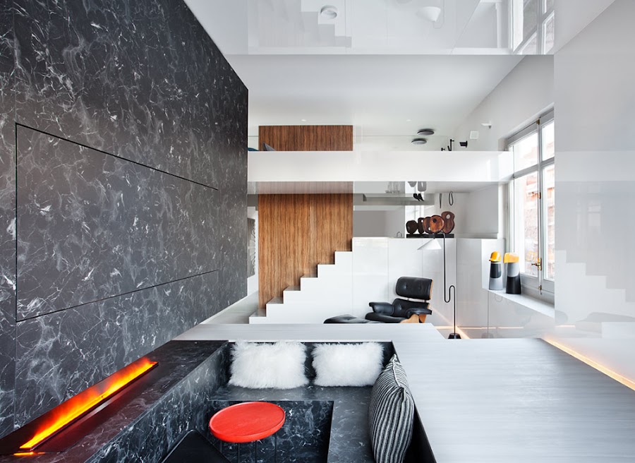 Plataformas a diferentes alturas delimitan las diferentes zonas: la cocina, un salón con chimenea y el dormitorio y baño, de este mini-apartamento de 28 m2 diseñado por el arquitecto Héctor Ruiz-Velázquez en el que todo el espacio está realizado con paneles laminados de Alvic ¡Incluido el cuadro que decora la pared!