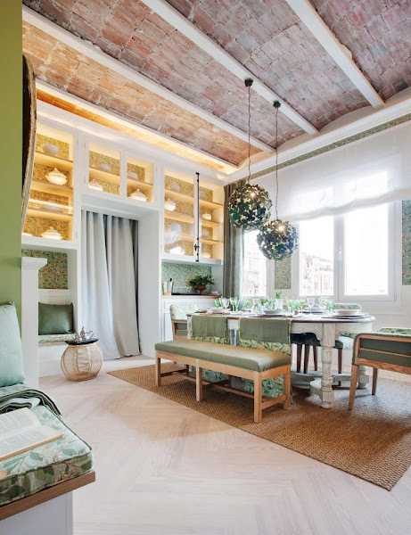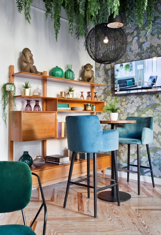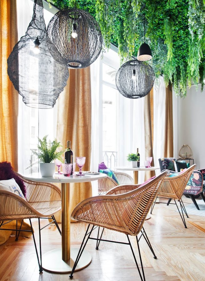 Y es que, los muebles y los complementos decorativos no se adhieren a un solo estilo, ¡sino a todos!, en un ambiente exuberante, vegetal y tropichic en el que los tonos berenjena y verde, y ese maravilloso techo decorado con plantas colgantes que es el protagonista absoluto.