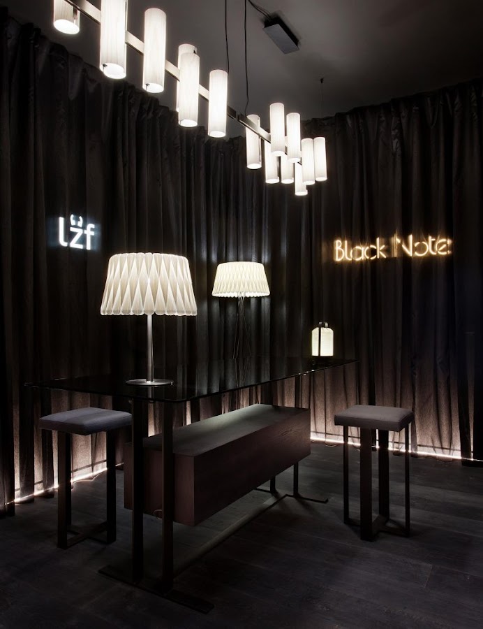 El espacio “Black Note” se concibe como el vestíbulo de un hotel de unos 16m2 en el que se combinan los materiales cálidos de los tejidos y las maderas, con los metales de las estructuras y el vidrio de la mesa. Por aquí lo vemos muy oscurote ¿Vosotras?