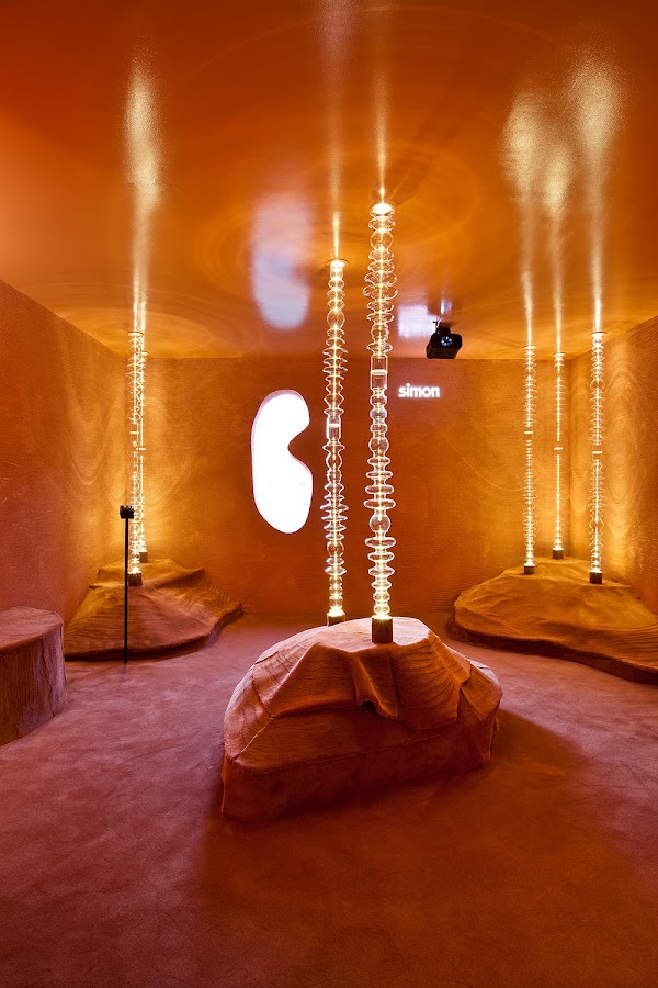 El espacio Simon, diseñado por Mayice Studio, transporta al visitante a un escenario mágico y lejano, a través del tiempo hasta los orígenes del cristal. Porque... ¿Sabéis que relación tiene el cristal con la arena?
