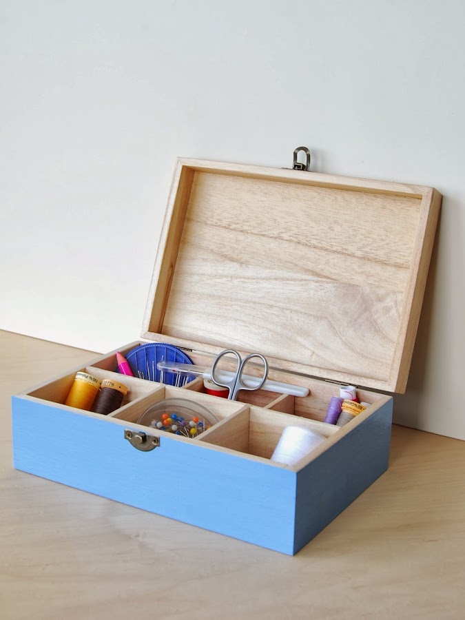 Esta cajita, procedente del mismo taller de carpintería que cerraba, seguramente estaba pensada para guardar bolsitas de te, pero para nosotros era un costurero perfecto para mi madre, así que rebajamos la madera de atrás para que cupieran las tijeras encima y el resto pasaron a ser compartimentos para que pudiera encontrar mejor los hilos y botones.