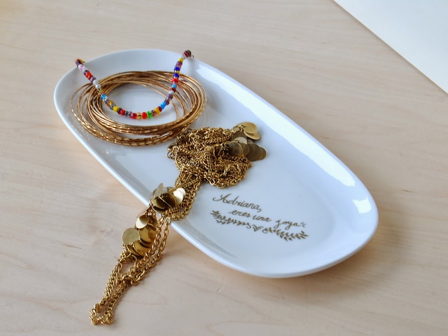 Este plato de porcelana (Made in Spain, por cierto), fue decorado con rotulador dorado especial para porcelana y el mensaje está claro: recordarle cada día a mi hermana que es una joya (aunque a veces se le olvida).