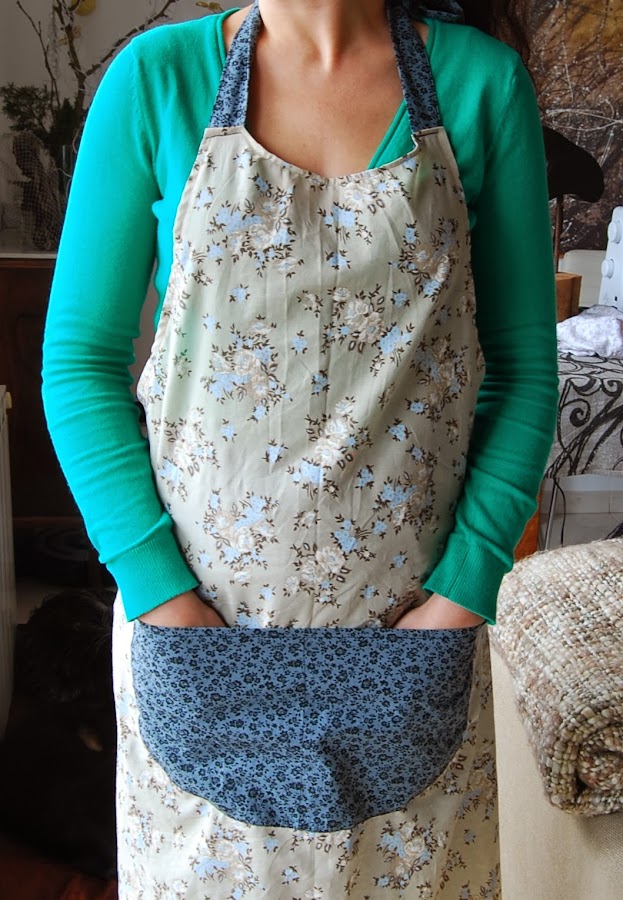 Y tenía unas telas antiguas muy bonitas que hacía tiempo que esperaban que hiciera algo con ellas, así que me atreví a hacer un delantal para mi madre, cogiendo como modelo un delantal que tenía en casa, sacando los patrones y dobladillo por aquí, dobladillo por allá... Quedó así! (prometo fotos mejores la próxima vez ;))