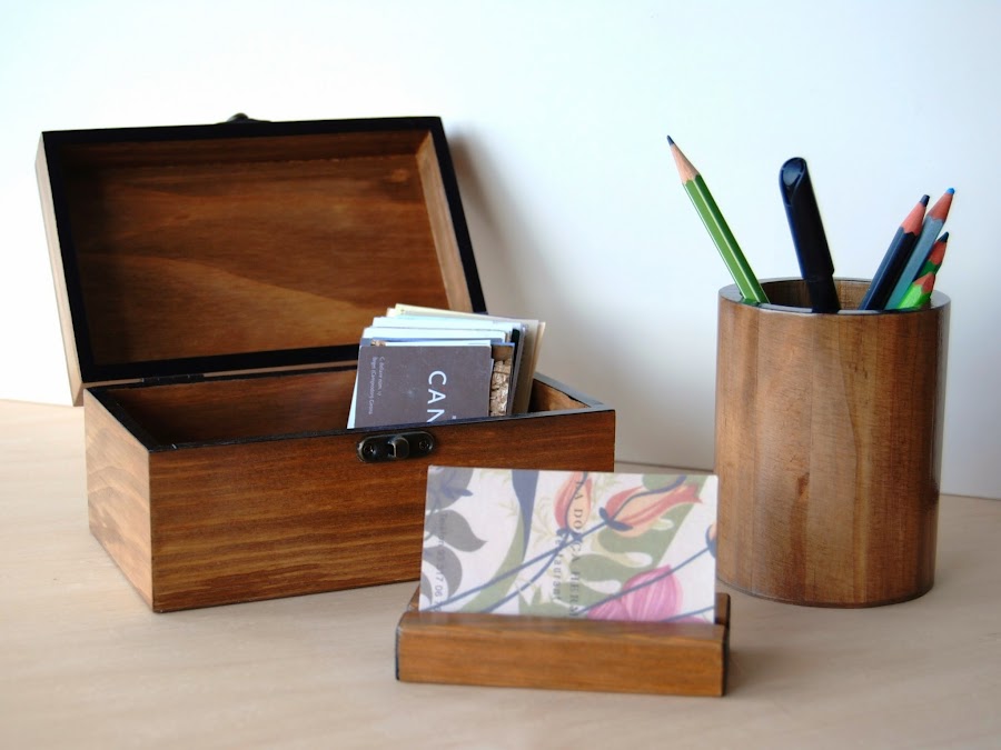 Este juego de oficina tiene una procedencia diversa: la caja para guardar tarjetas proviene de un taller de carpintería que cerraba y nos llevamos algunos excedentes, el lapicero era de segunda mano y lo tuvimos que decapar y teñir para darle un aspecto homogéneo, y el tarjetero lo hicimos a partir de un trozo de madera.
