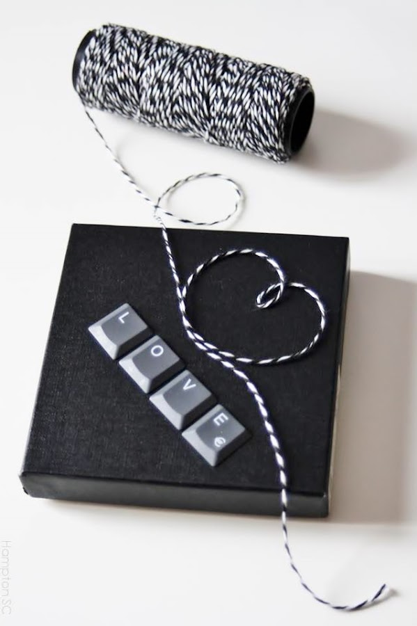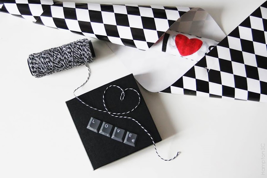 Papel de regalo en blanco-negro y baker twine para atarlo.