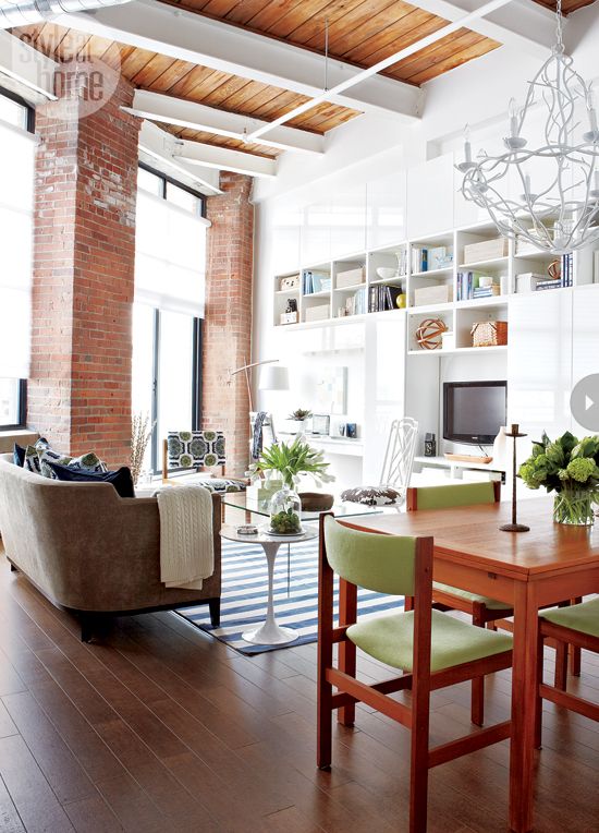 con más espacios grandes. Éste más moderno, vigas a la vista, más techos altos, ¡suelos de madera en blanco!, luz que entra a raudales por los grandes ventanales, con piezas que le imprimen bastante personalidad, como el cuadro en relieve central o la mesa de madera sin tratar, a la izquierda. Cocina al fondo y toooooda una pared con muebles de obra, para almacenar. Siempre el blanco de base.