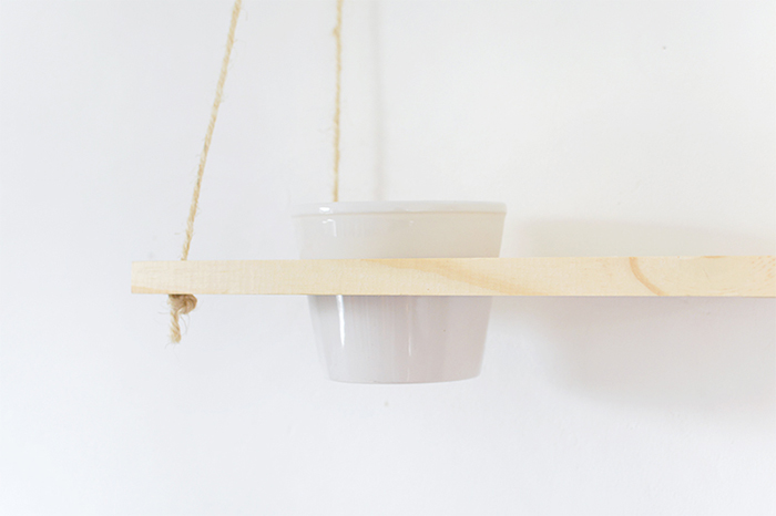Es realmente muy sencillo, ya que sólo hay que taladrar 4 agujeros en los extremos de la balda por donde luego pasaremos la cuerda que hará de colgador a pared. Lo único que requiere un poco más de detalle es tomar la medida correcta del macetero para perforar el agujero en la balda y que quede bien colocada nuestra planta.
