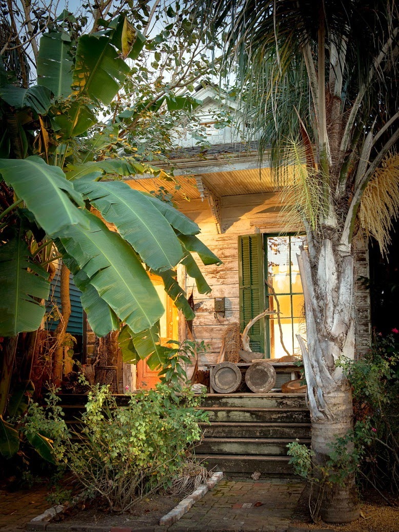 Al ver estas imágenes nos pareció haber descubierto una casa en medio de la selva, de esas que tuvieron una vida espléndida en épocas coloniales y que con los años la vegetación la ha engullido en su abrazo... Pero en realidad se trata de una casa nueva, en New Orleans, que ha sido decorada inspirada en los acontecimientos que han azotado esa región: la naturaleza contra el hombre... El resultado: un equilibrio entre esa lucha del hombre por dominar la naturaleza, y el poder de la madre tierra... ¿No te parece poético el resultado?