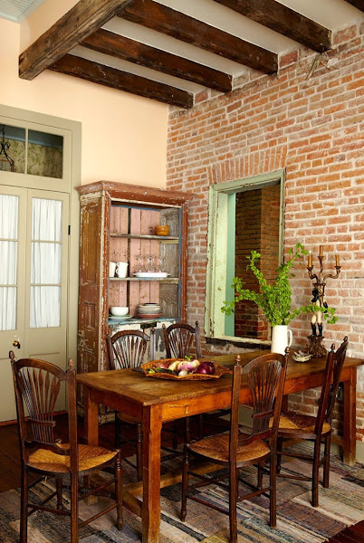 Quizás la cocina es la que guarda una mayor calidez y lo hace a través de piezas antiguas y desconchadas, mientras que la sala de estar, muy estrecha, gana profundidad gracias a la estantería con fondo de espejo. Una suave paleta de colores integra a la perfección la pared de ladrillo rojo y harmoniza el ambiente. El resultado no puede tener más encanto y magia... Consigue un estilo así con piezas antiguas y con alma, como las que encontrarás en nuestra shop online, o quizás necesitas ayuda para un proyecto especial, descubre todo lo que podemos hacer por ti aquí. Y feliz martes!!!