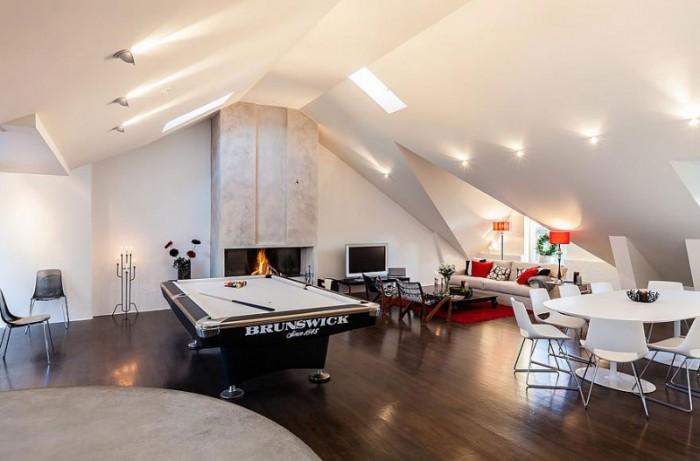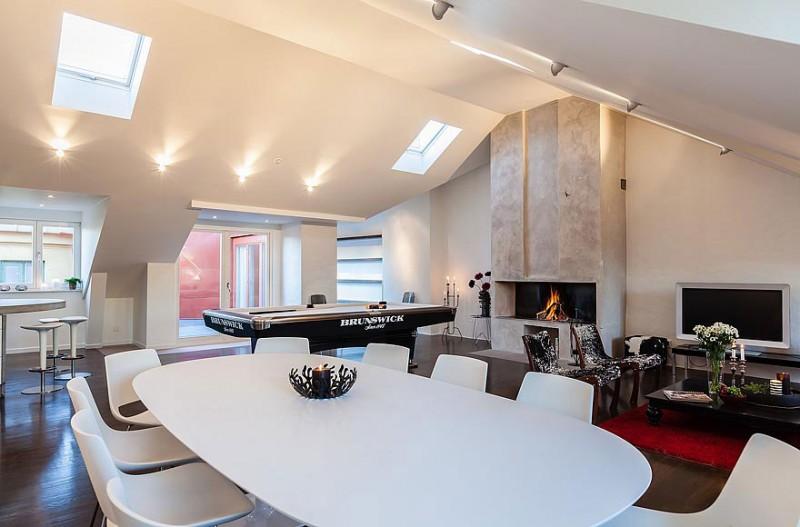 El salón tiene varias zonas de ocio y descanso, presididas por una chimenea que es el punto focal del espacio. !Todo un lujo tener el espacio suficiente para poner un billar!