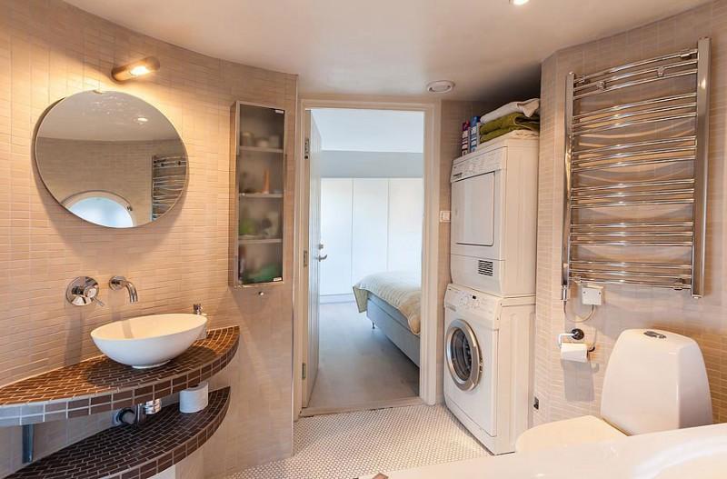 Como tienen costumbre en los paises nórdicos, la zona de lavado está situada en el baño, aunque queda muy disimulada porque el baño es un gran espacio circular y al quedar en la entrada del mismo, la vista se va hacia las distintas piezas que la componen.