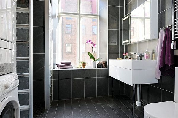 En el baño. sin embargo, han elegido un azulejo negro, que en contraste con los sanitarios blancos hacen un conjunto muy elegante.