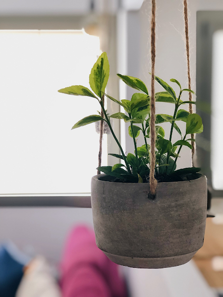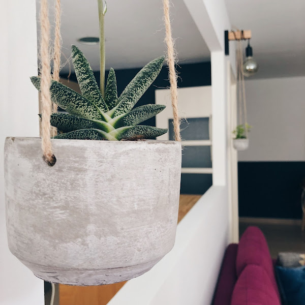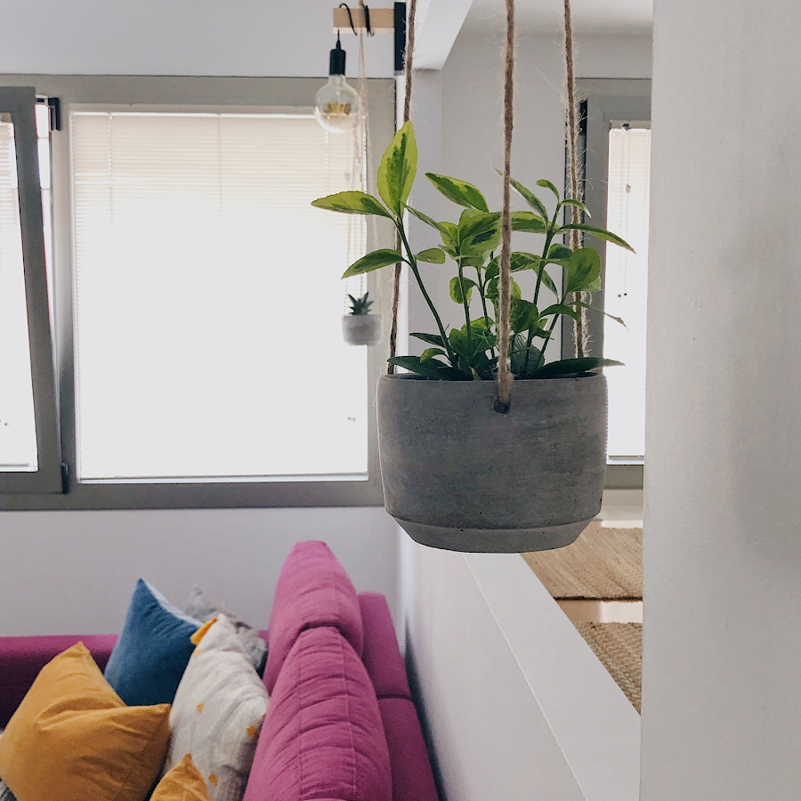 El problema es que no sabía ni dónde ponerlo ni cómo, los de macramé por ejemplo me encantan en todos sus tamaños y formas pero no me encajaban al decidir finalmente dónde quería ponerlos. Se me ocurrió encontrar algo que colgase de dos lámparas que tengo a ambos lados del sofá del salón, para dale un poco de "alegría verde" a esta zona. Es un espacio un poco complicado porque enmarca un gran rectángulo abierto en la pared que conecta la cocina y el salón. Me topé con dos maceteros pequeños de cemento de muymucho que parecían hechos para mí. Lo único que tuve que hacer es poner unas cuerdas más largas para que quedasen justo a la altura que me gustaba. ¡Este es el resultado!