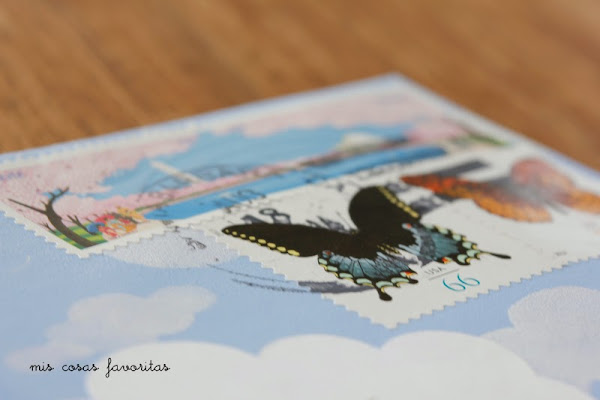Un dibujo de nubes, unos sellos americanos made-in-USA y unos textos hand-made en colores aguados. Madre mía que bonito. Es una carta de Laura del blog Bajo un limonero.