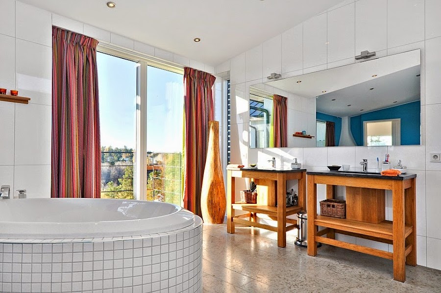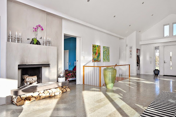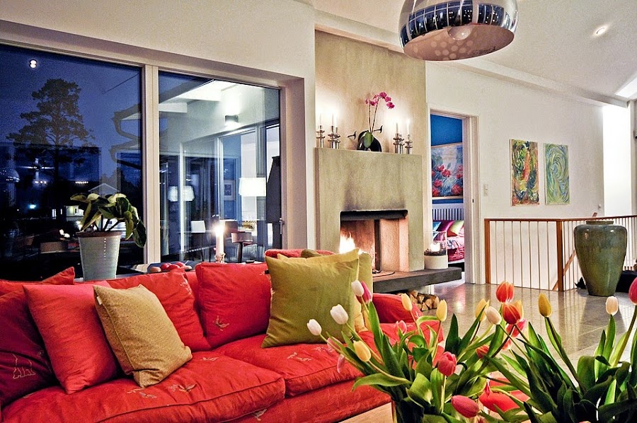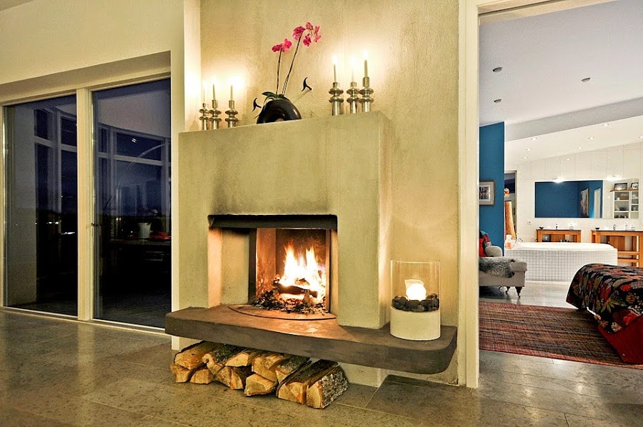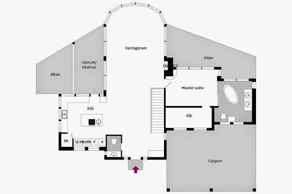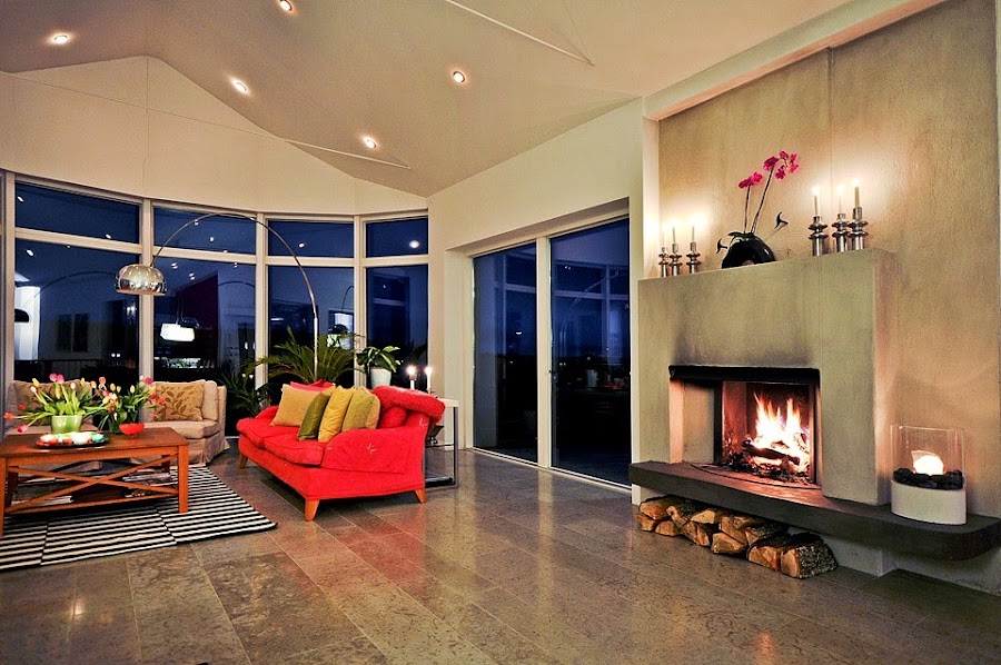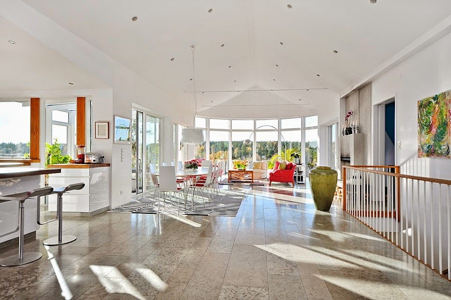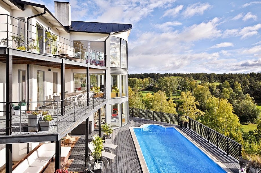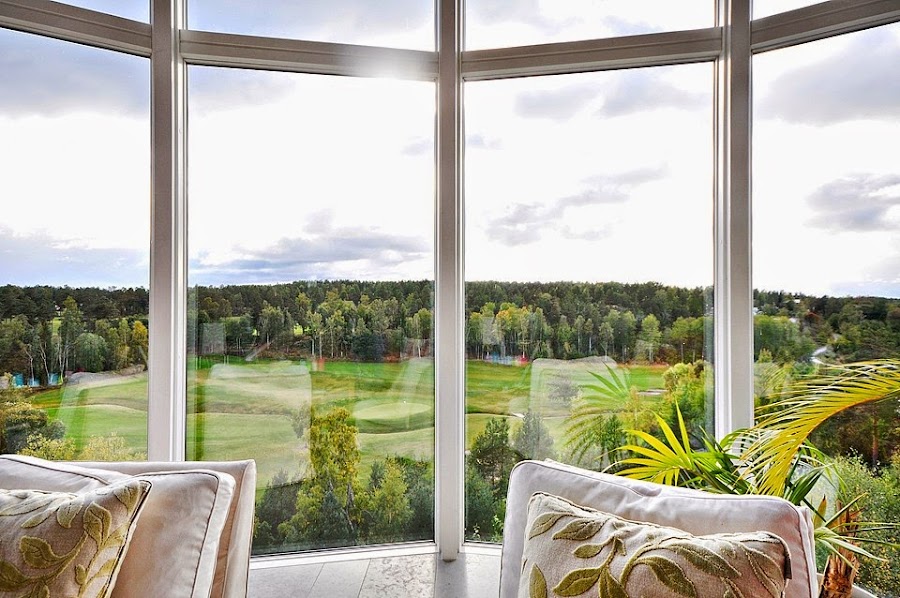 La arquitectura evoca las llamadas casas de pájaros en zancos, a menudo el equilibrio sobre las colinas alrededor de Beverly Hills. Estas casas suelen mostrar un lado contrario interior sin pretensiones, se abre a una vista impresionante. Esto es exactamente lo que te da la bienvenida en el momento en que entras en el amplio hall de la casa, que se funde en el gran salón. La sensación de luz y espacio extenso se siente inmediatamente al entrar. Hay techos altos y sobre el suelo descansa una hermosa piedra caliza que se extiende por el nivel superior. El fondo está dominado por una impresión bellamente redondeada, que corre verticalmente a lo largo de la casa de tres pisos. Ahora se está abriendo una extraordinaria panorámica. También queda claro qué tan alto la casa es, de hecho, se puede apreciar el nivel de las copas de los árboles de abajo. A la izquierda del hall, se ubica un aseo con inodoro y lavabo. A pocos pasos de la sala se abre a la cocina a la izquierda. Las grandes ventanas dejan pasar la luz y amplían el panorama más hacia el sur y el sureste. De vuelta en la sala grande, se encuentra la chimenea con estilo a la derecha. Una noche fría de otoño crepita y calienta tanto la cocina, y el área de comedor situada en el interior de la carga de vidrio redondeada. Esto abre la vista aún más. Tiene vistas al campo de golf muy por debajo. Por las noches, se abre este cielo estrellado y en la distancia se pueden ver las luces que brillan. A la derecha de la sala de estar se encuentra la zona del dormitorio principal de la casa y el cuarto de baño de planta abierta. A un vestidor generoso se accede a través de una puerta. La entrada de vidrio deslizante hacia la terraza privada se encuentra en la orientación sur-oeste, y puede quedar entreabierta una noche de verano. Aunque se trata de una chimenea que es visible tanto desde la cama como desde el baño. El cuarto de baño de cinco estrellas, está decorado con muy buen gusto, con bañera, inodoro, ducha y lavabo doble.