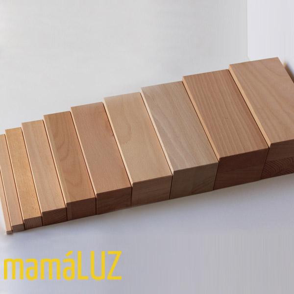 Pero MamáLUZ es mucho más que eso. Ellos quieren ofrecer otras líneas de productos inspirados en pedagogías como Montessori, Reggio Emilia, Waldorf y Pikler, que hagan que nuestros hijos comprendan el mundo mejor y les faciliten su desarrollo personal. Consideran que hay alternativas y recursos educativos suficientes para que nuestros hijos no estén expuestos a la televisión, los ordenadores, las consolas, e iniciaron el proyecto de MamáLUZ con las cajas de luz dando a conocer otras formas de favorecer la creatividad e imaginación de los más pequeños. Además, no únicamente están orientados a familias, si no también a escuelas, así que todas aquellas maestras que me seguís (que sé que sois mucha, apuntad en negrita esta tienda!) Mirad que pasada de escalera, hay tantos aprendizajes detrás de estos bloques de madera…
