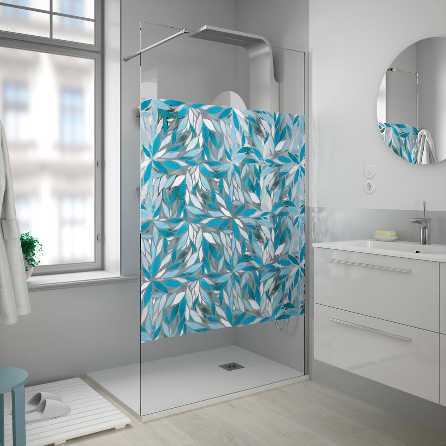 Un buen ejemplo de un decorado original para para una mampara de ducha lo encontramos en la siguiente imagen. En esta mampara de paso se ha optado por un decorado con motivos florales en tonos azules, grises y blancos. El resultado es una mampara elegante y moderna.