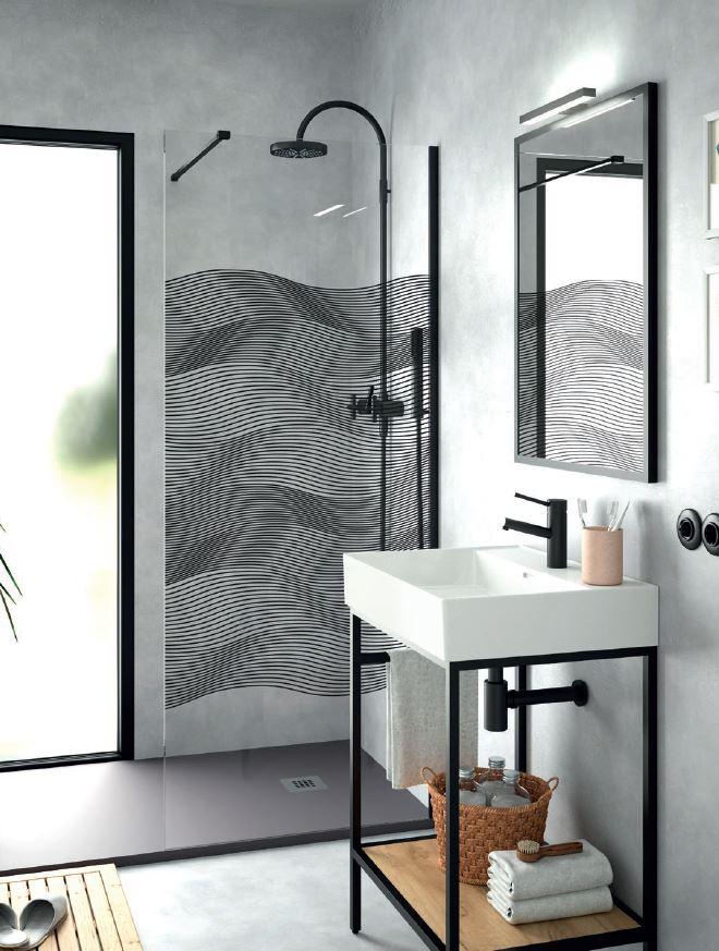 Dejando por un momento los decorados, también queremos hacer una mención especial a la mampara Habitat de Salgar. Se trata de una mampara plegable sobre un eje pivotante que está pensada especialmente para espacios reducidos ya que se abre en el interior de la ducha más de un 50%. Además, su rango mínimo va de los 660 a los 700 milímetros, una medida difícil de encontrar en otros modelos.