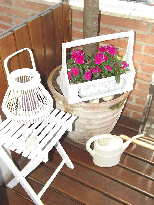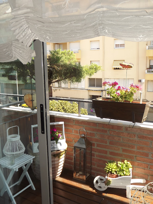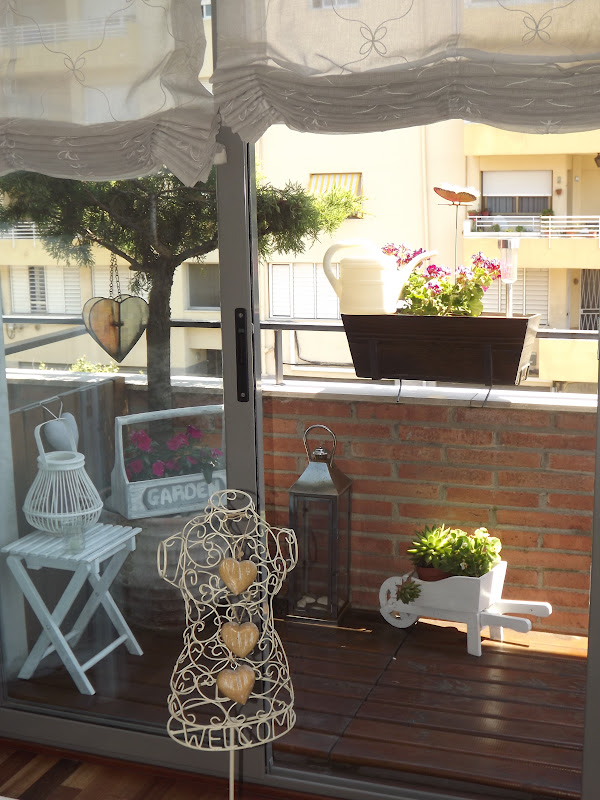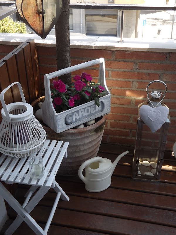 Los complementos en el exterior tambien son importantes,ahí están mis faroles de Jardiland,mi corazón colgante con vela de un viaje a Lanzarote,mi mesita de Ikea y los diferentes maceteros comprados aquí y allí...Nuevamente os diré que no hace falta un jardín o una gran terraza,bastan unos pocos metros para crear un pequeño rincón al exterior y disfrutar de los largos veranitos.Por la mañana al levantarte y abrir tus ventanas la imágen que te brinda tu rincón te llenará de todo lo mejor...