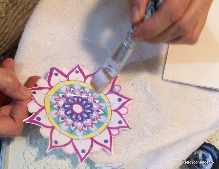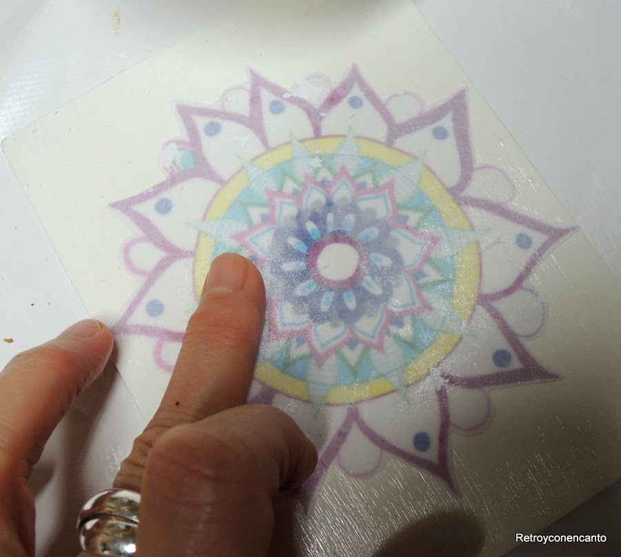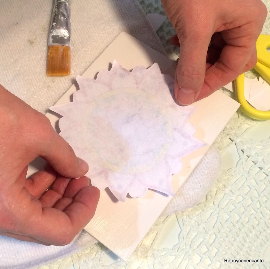Debemos ser las únicas, en este mundo de las manualidades, que nunca habíamos probado a hacer un transfer...¡y ya era hora! Después de hacer una copia del original, recortamos la figura y aplicamos foto transfer en la madera y en el dibujo.