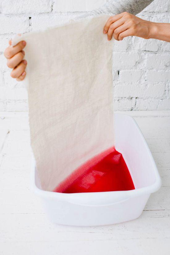 Manteniendo la tela lo más recta posible, sumergirla en el agua unos 2-3 centímetros y dejar que el colorante penetre bien durante un minuto aproximadamente. Retirar la tela y dejarla reposar encima de un trozo de plástico hasta que se seque, veréis que el tinte seguirá poco a poco degradando el tejido.
